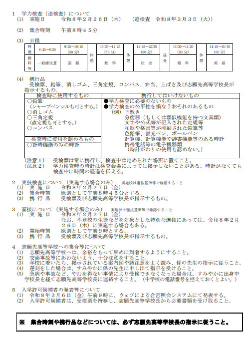 持ち物や試験時間などが載っておりますので、受験生の方は必ず確認してください。
